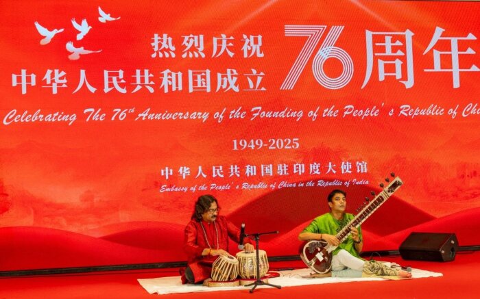 Indian artists perform at a reception in New Delhi on Sept 23 to celebrate the 76th anniversary of the founding of the People's Republic of China. [Photo provided to chinadaily.com.cn]