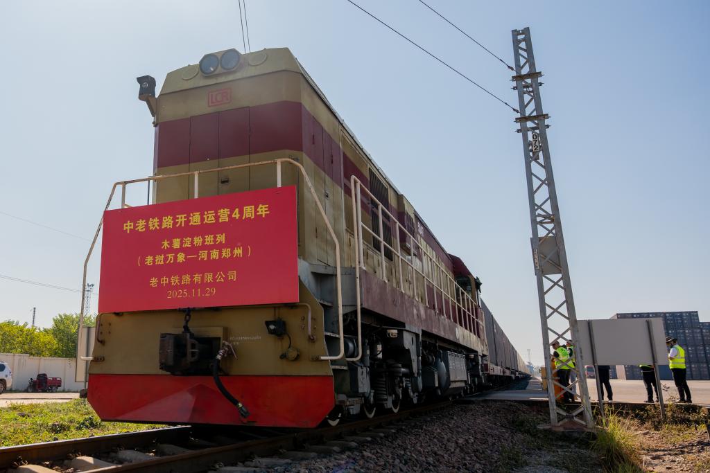 2025年11月29日,在老挝首都万象中老铁路万象南站,一列满载1000吨木薯淀粉的铁路集装箱班列准备出发,前往中国城市郑州。新华社发(凯乔摄)