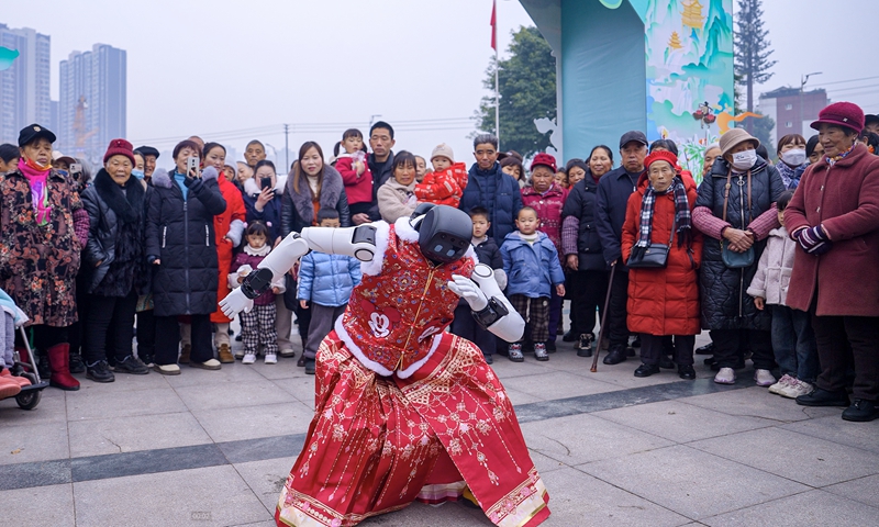1月11日,天府新区兴隆街道“趣兴隆 逛糖会”上,机器人“摊主”的机械舞,引来居民围观。(受访对象供图)