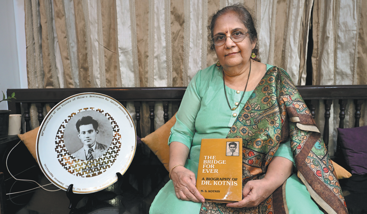 Sumangala Borkar, niece of Indian physician Dwarkanath Kotnis, displays a commemorative plate and a biography of Kotnis at her home in Mumbai, India, on Aug 2. JAVED DAR/XINHUA